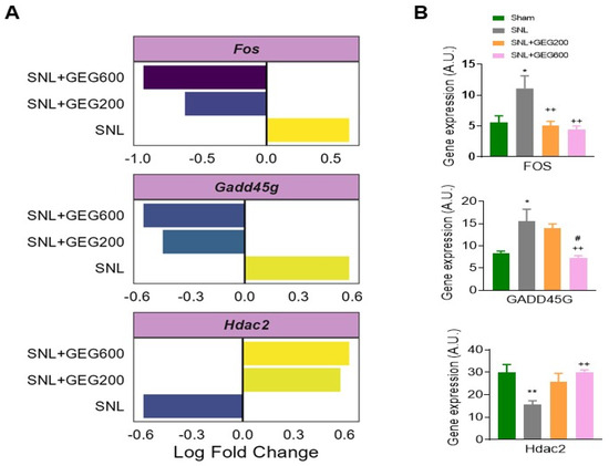 Gene expression analysis of selected neuroinflammation factors, i.e., Fos, Gadd45g, and Hdac2 between groups (A); mRNA expression assessed by qRT-PCR (B). (A) Genes show differential expression between all groups, i.e., p-value < 0.05 and fold change > 1.25. Log2-fold change in gene expression is shown along the x-axis. SNL indicates fold change between SNL vs. sham, SNL + GEG200 indicates fold change between SNL + GEG200 vs. SNL, and SNL + GEG600 indicates fold change between SNL + GEG600 vs. SNL. (B) Fos, Gadd45g, and Hdac2 significantly increased in SNL rats (* p < 0.05, ** p < 0.01 one-way ANOVA, n = 9) compared to sham rats. SNL + GEG200-group rats showed decreased Fos expression (++ p < 0.01 one-way ANOVA, n = 9), but not Gadd45g and Hdac2 expression, compared to SNL rats. SNL + GEG600-group rats showed decreased Fos, Gadd45g, and Hdac2 expression (++ p < 0.01 one-way ANOVA, n = 9) compared to SNL rats. SNL + GEG600-group rats showed decreased Gadd45g expression (# p < 0.05 one-way ANOVA, n = 9) compared to SNL + 200-group rats. Abbreviation: Fos, FBJ osteosarcoma oncogene; Gadd45g, growth arrest and DNA-damage-inducible 45 gamma; Hdac2, histone deacetylase 2.