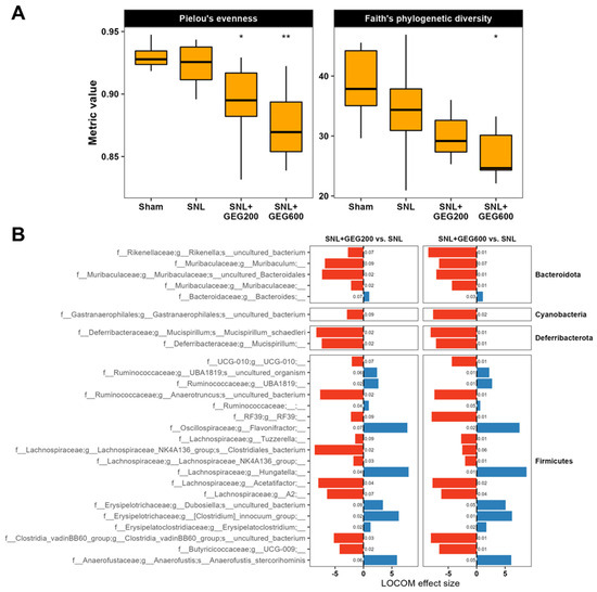 Gut microbiome composition analysis in SNL rats. (A) Alpha-diversity evenness and richness are indicated across groups using box plots. Asterisks (* p < 0.05, ** p < 0.01) indicate statistical significance for SNL + GEG200 vs. SNL and SNL + GEG600 vs. SNL comparisons using the Wilcoxon signed-rank test. (B) SNL + GEG200 vs. SNL, SNL + GEG600 vs. SNL compositional microbiome analysis using LOCOM. ASVs presented are those with raw p-values < 0.05 and Benjamini–Hochberg-adjusted p-values < 0.1. LOCOM effect size is indicated on the x-axis and ASVs are indicated on the y-axis. Benjamini–Hochberg-adjusted p-values are indicated next to the corresponding bars.