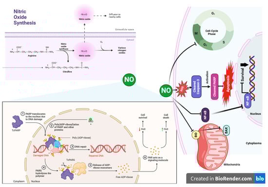 Under normal conditions, the cellular concentration of p53 remains low as it undergoes rapid degradation. However, DNA damage triggers the accumulation of p53. Experiments conducted on macrophages and RINm5F insulinoma cells have demonstrated p53 accumulation in •NO-induced cell death scenarios [,]. Further research revealed that L-NMMA, a nitric oxide synthase (NOS) inhibitor, suppresses p53 accumulation induced by cytokines or lipopolysaccharides (LPS), indicating an active involvement of •NO in this process. Some evidence suggests that •NO’s effect on p53 accumulation may be linked to its ability to inhibit proteasome function, thus interfering with p53 degradation pathways [,]. Nevertheless, further experiments have uncovered the operation of p53-independent pathways in •NO-induced apoptosis [,]. Additional studies have elucidated a negative feedback mechanism between the levels of •NO and p53 in various human cell types: the accumulation of •NO leading to DNA damage triggers the expression of p53, which in turn suppresses the human inducible nitric oxide synthase (iNOS) gene []. Additionally, •NO represses iNOS expression by dampening NFκB activity in hepatocytes. Through these intricate pathways, the precise regulation of •NO synthesis is achieved, thus mitigating its deleterious effects on the tissue (Figure 1) [,,].