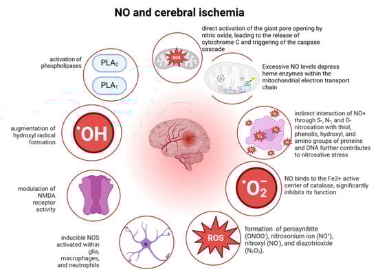 Nitric oxide and cerebral ischemia. This figure was generated using BioRender.