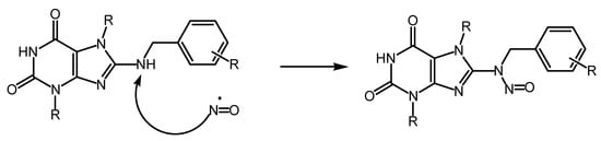 The •NO radical is a potent nitrosating agent, demonstrating its detrimental impact on thiol and amino groups within protein molecules. 8-benzylaminooxanthines can function as •NO scavengers, transforming into corresponding 8-N-nitrosobenzylaminooxanthines under •NO radical exposure, thereby mitigating its adverse effects (Figure 3).