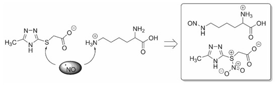 The compound (S)-2,6-diaminohexanoic acid 3-methyl-1,2,4-triazolyl-5-thioacetate (Angiolin) demonstrates •NO scavenger properties. The •NO activity of this compound is attributed to the reactivity of both its cationic and anionic parts. Specifically, lysine interacts with •NO through its ε-amino group, forming the corresponding N-nitroso derivative. Concurrently, the anionic portion of Angiolin appears to generate S-nitro derivatives, similar to those described elsewhere. It is evident that the •NO activity of both the anionic and cationic parts of Angiolin is synergistic, explaining its pronounced effectiveness. The mechanism of interaction between the Angiolin molecule and •NO may involve electron transfer from the highest occupied molecular orbital of the “spin trap” to the lower unoccupied molecular orbital of the nitrogen monoxide radical, leading to the formation of a more stable complex compound. Angiolin may function as a •NO transfer molecule, enhancing its bioavailability [].