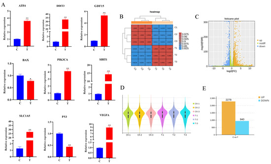 Analysis of RNA-Seq data and qRT-PCR validation. (A) qRT-PCR results of randomly selected ATF4, DDIT3, GDF15, BAX, PIK3CA, SIRT1, SLC1A5, P53, and VEGFA in control and experimental groups. (B) Heat map of sample. (C) Differential gene volcano plot. (D) Violin plot of samples. (E) Bar graph of differential genes. All experiments were repeated at least 3 times. * p < 0.05, ** p < 0.01.