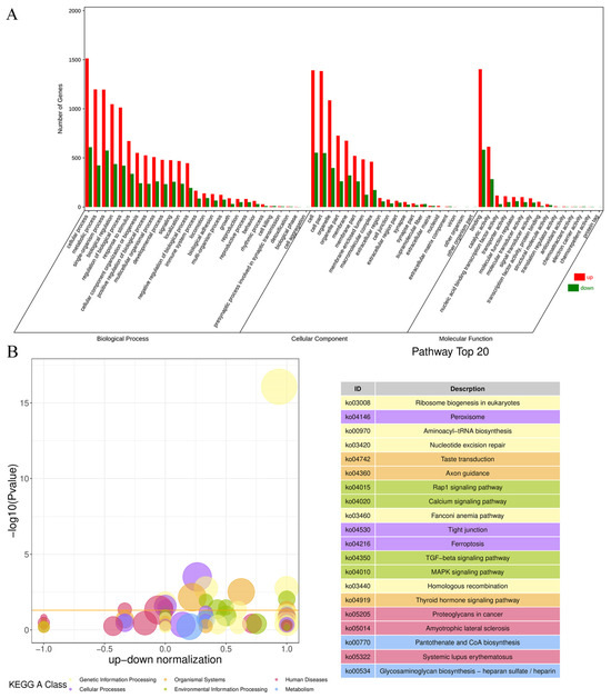 The results of the GO analysis (Figure 4A) reveal that the DEGs were categorized into 62 secondary entries involving three categories: biological processes, cellular components, and molecular functions. The largest proportions of the 27 secondary entries in the bioprocess classification were cellular, metabolic, and single-organism processes. The largest proportions of the 20 secondary entries in the cellular component classification were cells, cell parts, and organelles. The largest proportions of the 15 secondary entries in the molecular function classification were for binding, catalytic activity, and nucleic acid-binding transcription factor activity. The results of the KEGG analysis (Figure 4B) highlight that the impact of fluoride on ovine follicular GCs are primarily associated with genetic and environmental information processing and cellular processes. These pathways encompass nucleotide excision repair, ribosome biogenesis in eukaryotes, the calcium signaling pathway, TGF-beta signaling pathway, MAPK signaling pathway, peroxisome, tight junction, and ferroptosis.