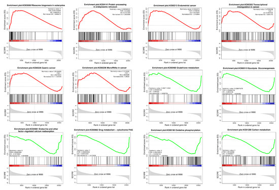 Results of GSEA. The red curve represents the activated pathway, and the green curve represents the inhibited pathway.