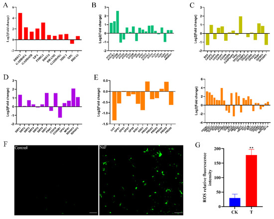 Histogram of RNA-Seq gene expression visualization. (A) Histogram of logarithmic values of DNA damage-related genes in RNA-Seq data. (B) Histogram of logarithmic values of autophagy-related genes in RNA-Seq data. (C) Histogram of logarithmic values of apoptosis genes in RNA-Seq data. (D) Histogram of logarithmic values of mitochondria-related genes in RNA-Seq data. (E) Histogram of logarithmic values of oxidative stress-related genes in RNA-Seq data. (F) Detection of ROS in control and experimental groups (10×, 100 µm). (G) ROS relative fluorescence intensity. ** p < 0.01.