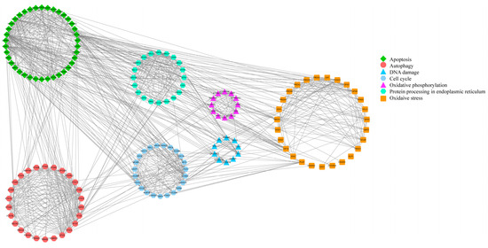 The PPI network diagram of 156 DEGs was constructed using STRING (Figure 7), and the 156 screened DEGs were categorized into seven classes: apoptosis, oxidative stress, autophagy, DNA damage, cell cycle, protein processing in the ER, and oxidative phosphorylation. The PPI network plot shows that the screened DEGs were closely associated with autophagy, oxidative stress, and apoptosis. Furthermore, 78 DEGs implicated in oxidative phosphorylation, endometrial cancer, adherens junctions, peroxisomes, and cellular senescence were categorized based on a literature review. The heat map (Figure 8A–F) shows that a large number of genes related to cancer and oxidative stress were activated. A PPI network map of the DEGs was constructed using STRING, and proteins with ≥ 4 connections were screened (Figure 8G,H).