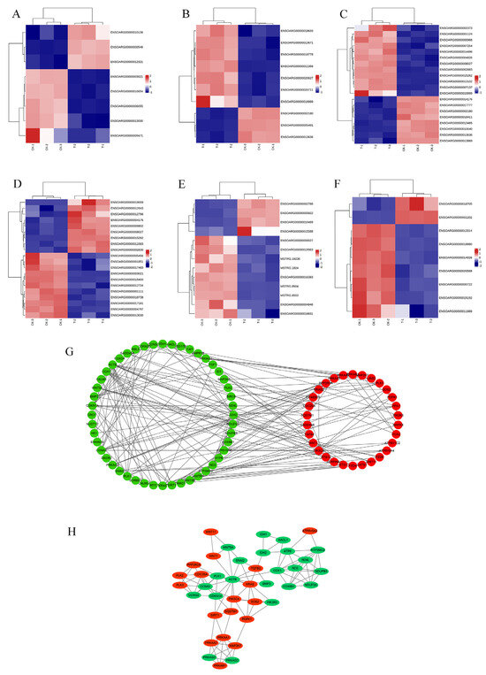 Results of DEG classification analysis of RNA-Seq. (A) Heat map of adherens junction-related genes. (B) Heat map of cancer-related genes. (C) Heat map of cellular senescence-related genes. (D) Heat map of Hippo pathway-related genes. (E) Heat map of oxidative phosphorylation-related genes. (F) Heat map of peroxisome-related genes. (G) PPI network map of DEGs. (H) proteins with ≥4 connections.