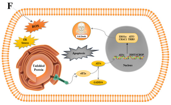 The synthesis, folding, and modification of proteins within the ER are tightly regulated, as they are fundamental to vital cellular functions and ultimately determine cell fate. The ER is very sensitive to stimuli from the internal and external environments, and under steady-state conditions, Bip proteins bind to ER stress sensors (three ER transmembrane proteins, ATF6, IRE1, and PERK) and remain inactivated [43]. When external environmental stimuli (e.g., hypoxia and drug toxicity) disrupt the internal environment of the ER, the oxidative environment in the ER lumen is also disrupted, and ER dysfunction occurs, resulting in the accumulation of unfolded proteins or misfolded proteins in the ER lumen, as well as the dysregulation of calcium homeostasis. In response, the ER stress response activates an adaptive effort to counteract these adverse factors and restore homeostasis in the body. When these countermeasures and severe imbalances persist, the ER stress response may initiate a pro-apoptotic program to eliminate defective cells and allow the entire organism to survive [44]. The above ER sensors are released, resulting in ER stress, which induces an unfolded protein response [45,46,47,48,49].