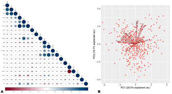 Correlation and principal component analysis of antioxidant activity (AOA) and seed phytochemical components. (A) Correlation plot of AOA with seed phytochemical components. (B) Principal component analysis plot. AOA, antioxidant activity; TPC, total phenolic content; TFC, total flavonoid content; Smin, sesamin; Slin, sesamolin; T lign, total lignan; Camp, campesterol; 5-Aven, 5-avenasterol; Sitos, sitosterol; Stig, stigmasterol; TPS, total sterols; Vit E, vitamin E (tocopherol); OC, oil content; OA, oleic acid; Lnic A, linolenic acid; SA, stearic acid; Lneic A, linoleic acid; PA, palmitic acid; Mel, melatonin.