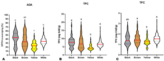 Variation in antioxidant activity (A), total phenolic content (B), and total flavonoid content (C) among black (n = 45), brown (n = 85), yellow (n = 32), and white (n = 234) sesame seeds from different accessions. The red lines indicate the mean. Black dotted/dashed lines indicate quartiles. Different letters above the violin plots indicate statistical differences at p ˂ 0.05.