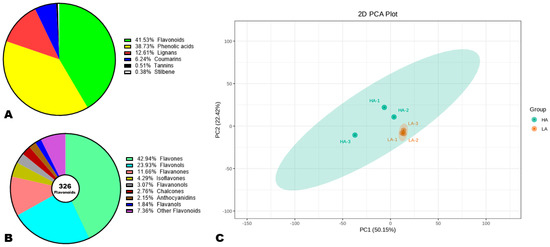 Variation in the polyphenol profiles of high (HA) and low (LA) antioxidant seeds. (A) Classification of the 785 identified phenolic compounds. (B) Sub-classification of flavonoids. (C) Principal component analysis (PCA). HA-1, HA-2, and HA-3 represent the three replications for HA. LA-1, LA-2, and LA-3 represent the three replications for LA.
