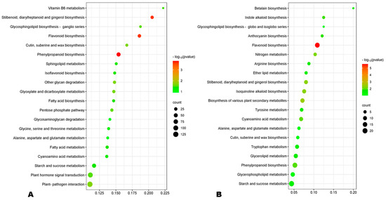 GO (gene ontology) analysis revealed that the DEGs at 10 DPA were mostly enriched to the membrane and its components, oxidoreductase activity, lipid storage, and carbohydrate metabolic process (Figure S10A). Meanwhile, the main enriched GO terms at 20 DPA were intracellular non-membrane, ribosome, structural constituent of ribosome, structural molecule activity, and peptide and amide metabolic processes (Figure S10B). At 30 DPA, the most enriched GO terms were extracellular region, carbohydrate metabolic process, and iron ion binding (Figure S11). These results indicate different metabolism regulations during HA and LA seed developmental processes. KEGG enrichment analysis of DEGs revealed that phenylpropanoid biosynthesis, flavonoid biosynthesis, and stilbenoid biosynthesis were the most significantly differentially regulated pathways between HA and LA at early and late seed developmental stages (Figure 6A,B). Meanwhile, ribosome metabolic processes were the main processes differentially regulated at 20 DPA (Figure S12). Taken together, these results show that differences in the regulation of flavonoid and phenolic acid biosynthesis are the key driven mechanisms of variation in sesame seed AOA.
