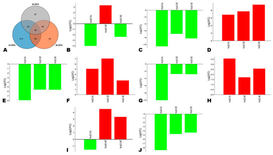 To verify the implication of phenylpropanoid metabolism in variation in sesame seeds AOA, we carried out a comparative transcriptome analysis of HA and LA varieties at three seed developmental stages, including 10, 20, and 30 DPA (days post-anthesis). The summary of the high-throughput RNA sequencing data is presented in Table S5. The reliability of the RNA-seq data was confirmed through qRT-PCR analysis of eight randomly selected genes, with a consistency of R2 of 0.91 (Figure S9). Analyses revealed 2357, 1597, and 627 DEGs between HA and LA at 10, 20, and 30 DPA, respectively (Figure 5A). Of these DEGs, 1114, 885, and 347 were up-regulated in HA at the respective developmental stages (Figure 5A). A Venn diagram showed that only 170 genes were differentially expressed between the two seed types along with the seed development (Figure 5B).