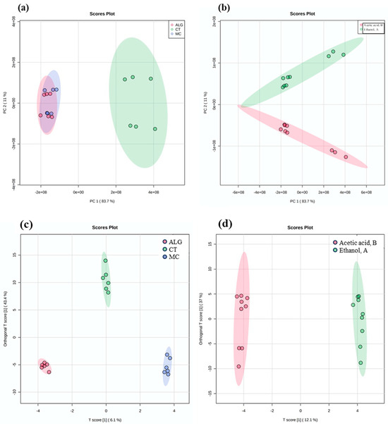 Unsupervised principal component analysis (PCA) considering the profile of migrated polyphenols based on (a) the type of PLA film coated (ALG: alginate; CT: chitosan; and MC: methylcellulose) and (b) the type of food simulant used (A and B). Supervised orthogonal projection to latent structures discriminant analysis (OPLS-DA) considering the profile of migrated polyphenols based on (c) the type of PLA film coated (ALG, CT, and MC), and (d) the type of food simulant used (A and B).