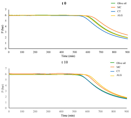 Oxitest analysis after 0 (t 0) and 10 (t 10) days of contact between the different coated PLA films: MC (methylcellulose, orange), CT (chitosan, blue), and ALG (alginate, yellow) and the food simulant D2 (olive oil) (green).