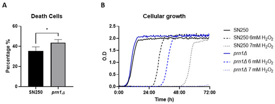 C. albicans SN250 and prn1∆ cell death and growth in the presence of H2O2. (A) Percentage of propidium iodide (PI)-positive dead cells measured by flow cytometry after 200 min in the presence of 10 mM of H2O2. Results represent the average of three biological replicates. Error bars indicate standard deviation. * p < 0.05, unpaired t-test. (B) Growth curves of both strains in the presence of 6 mM and 7 mM of H2O2. The graph presents the most representative curve of three biological replicates.
