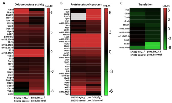 Gene Ontology (GO) enrichment for the biological process and function of all proteins with significantly increased abundance in each strain (Table S2) showed a high increase in proteins with the oxidoreductase activity GO term for both strains (Figure 3A), although in a higher number for SN250. Many of these proteins were different for each strain (Table S4). We also observed enrichment of protein catabolic process GO term proteins for both strains in the presence of H2O2 (Figure 3B). Increased proteins in the prn1∆ strain were mainly related to the regulatory subunit of the proteasome (Phb2, Pr26, Rpn3, and Rpt4), whereas these proteins in the SN250 strain were chaperones and ubiquitin-binding proteins involved in protein transport from Golgi to vacuole (Bzz1, orf19.4430, Vps4, and Mdj1). The prn1∆ strain also presented a greater decrease in the abundance of proteins associated with translation than the treated SN250 strain (Figure 3C). Both strains presented a decrease in nucleotide metabolic process GO term proteins, which are related to purine and pyrimidine biosynthesis, and this effect was higher in the prn1∆ strain (Figure S1). To emphasize the differential response of each strain to oxidative stress, GO term analysis was carried out for the proteins that exclusively increased in abundance for each strain (Figure S2). The 78 proteins that significantly increased in abundance only in the SN250 strain were significantly enriched in oxidoreductase activity proteins, suggesting a higher oxidative stress response when Prn1 is present. On the other hand, GO term enrichment of the 85 proteins that significantly increased in abundance only in the prn1∆ strain was related to proteasome-activating activity, which could indicate higher proteasome activity (Figure S2).