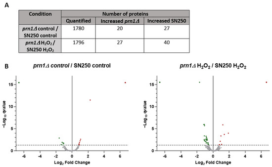 Comparative proteomics analysis between the SN250 and prn1∆ strains in the control condition and after 200 min of 10 mM H2O2 treatment. (A) Number of quantified proteins and those with differences in abundance for each strain. (B) Volcano plots representing proteins with a significantly different abundance between the two strains in each condition. Significant changes in the protein abundance (−log10 q-value > 1.3) are presented in red for prn1Δ strain or green for wild-type SN250 strain.