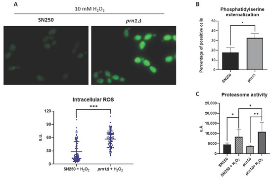 Effect of Prn1 deletion on cell redox homeostasis, apoptosis, and proteasome activity. (A) Intracellular ROS levels in the SN250 and prn1∆ strains after 200 min of 10 mM H2O2 treatment using the dihydrorhodamine 123 (DHR123) probe. (B) Phosphatidylserine (PS) externalization levels after 50 min of 10 mM H2O2 treatment using Annexin V staining. (C) Chymotrypsin-like proteasome activity after 200 min of 10 mM H2O2 treatment. Results represent the averages of three biological replicates. Error bars indicate standard deviation. * p < 0.05, ** p < 0.01, and *** p < 0.001, unpaired t-test.