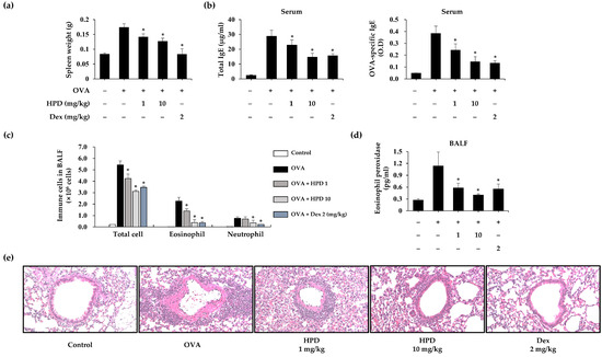The BALB/c mice were randomly divided into five groups (n = 5) as follows: control, OVA, OVA + HPD 1 mg/kg (low-dose), OVA + HPD 10 mg/kg (high-dose), and OVA + Dex 2 mg/kg (positive control drug). The mice were intraperitoneally sensitized with the OVA mixture (OVA 100 μg + alum 4 mg in PBS 200 μL) on days 0 and 7. Then, the mice were challenged for 30 min with OVA 3% solution in PBS that was administered as an aerosol by using an ultrasonic nebulizer (NE-U17; OMRON Corp., Tokyo, Japan) on days 14–17. At the time of the challenge, the mice received daily oral administration of PBS, HPD, or Dex. On Day 18, all mice were euthanized via isoflurane inhalation, and blood, bronchoalveolar lavage fluid (BALF), lung, spleen, and lymph node samples were collected for analysis (Figure S1). The splenic weight was measured immediately after sacrifice; the BALF sample was centrifuged at 500× g for 5 min at 4 °C, and the supernatant was stored at −80 °C.