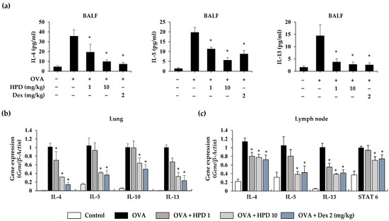 Allergic asthma predominantly involves a type 2 immune response that is mediated by type 2 cytokines. These cytokines cause pathological changes at the inflammatory site to induce exacerbation of asthmatic symptoms. To investigate the efficacy of HPD on allergic airway inflammation, BALF and lung tissue samples were analyzed by ELISA and qPCR. We evaluated the level of cytokines, such as IL-4, IL-5, and IL-13, and confirmed the production of type 2 cytokines (IL-4, IL-5, and IL-13) in BALF. HPD treatment alleviated the production of these inflammatory cytokines (Figure 2a). Next, we evaluated the gene expression of type 2 inflammatory cytokines (IL-4, IL-5, IL-10, and IL-13), which increased in lungs exposed to OVA but were suppressed with HPD treatment (Figure 2b). Moreover, cytokine expression in lymph nodes was evaluated because lymph nodes play an important role through T-cell activation-based mediation of the immune response to allergic asthma. We evaluated the gene-based expression of type 2 cytokines (IL-4, IL-5, and IL-13) and STAT 6, which is a transcription factor that plays a crucial role in the pathogenesis of allergen-induced airway inflammation. The gene expression levels were increased in OVA-exposed mice, whereas they was suppressed after HPD treatment (Figure 2c). These results suggest that HPD alleviates airway inflammation by suppressing the type 2 immune response in OVA-induced allergic asthma.