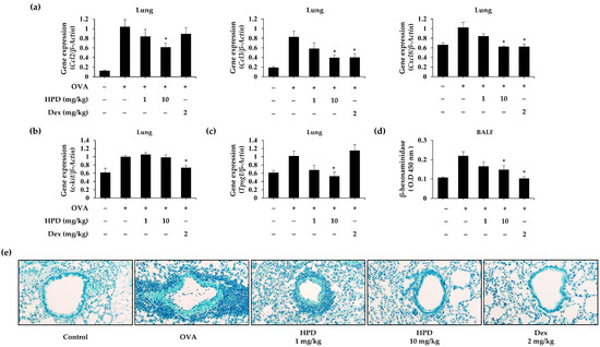 Effects of HPD on mast cell mediated immune response in OVA-induced allergic asthma. (a) The gene expression of chemokines (CCL2, CCL3, and CXCL8) was analyzed by qPCR. (b,c) The gene expression of mast cell markers (c-kit and Tpsg1) was analyzed by qPCR. β-Actin was used as internal control to normalize gene. (d) The degranulation of mast cells was measured by β-hexosaminidase assay. Values are mean ± SEM (n = 5). * p < 0.05 relative to OVA group. The paraffin-embedded lung sections were stained with Toluidine blue (e). Dex: dexamethasone. The magnification of representative images was 200×.