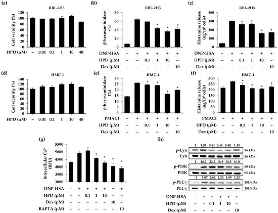 Effects of HPD on mast cell degranulation and signaling pathway. RBL-2H3 and HMC-1 cells were incubated at different concentrations (0.1–40 μM). After 24 h, each cell viability was measured by (a) MTT and (d) WST-1 assay. Values are mean ± SEM (n = 5). The degranulation of mast cells was measured by (b,e) β-hexosaminidase and (c,f) histamine assay using conditioned media of RBL-2H3 and HMC-1 cells. Values are mean ± SEM (n = 3). (g) Intracellular calcium level was measured by using Fluo-4 AM in RBL-2H3 cells. Values are mean ± SEM (n = 5). (h) The phosphorylation of Lyn, PI3K, and PLC-γ was measured by Western blot. The total forms of each protein were used as loading controls. Dex: dexamethasone. * p < 0.05 relative to DNP-HSA or PMACI group.