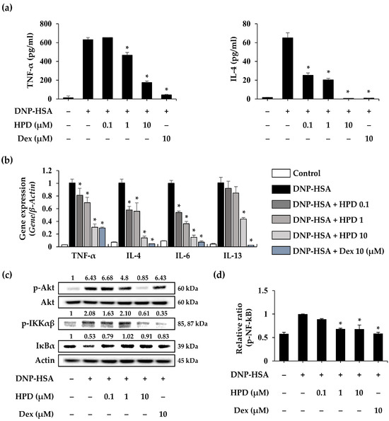 Effects of HPD on inflammatory cytokine secretion and expression in activated mast cells. (a) The levels of cytokines (TNF-α and IL-4) were measured by ELISA. (b) The gene expression of cytokines was measured by qPCR. β-Actin was used as internal control to normalize genes. (c) The p-Akt, p-IKKαβ, and IκBα were measured by Western blot. The actin was used as a loading control. (d) The level of p-NF-κB was measured by ELISA. Dex: dexamethasone. Values are mean ± SEM (n = 3). * p < 0.05 relative to DNP-HSA group.