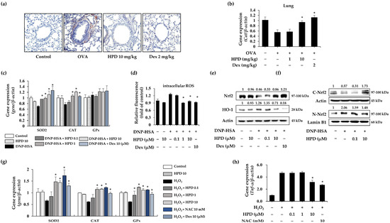 Antioxidant effects of HPD on OVA-induced mice and mast cells stimulated with DNP-HSA or H2O2. (a) The paraffin-embedded lung sections were stained with iNOS antibody. (b) The gene expression of catalase in lung homogenates of OVA-induced mice were measured by qPCR. Values are mean ± SEM (n = 5). * p < 0.05 relative to OVA. (c) The gene expression of antioxidant enzymes (SOD2, CAT, and GPx) in DNP-has-stimulated RBL-2H3 cell was analyzed by qPCR. (d) Relative intracellular ROS level was measured by using H2DCF-DA. (e) The Nrf2 and HO-1 in whole cell lysates were measured by Western blot. (f) The cytoplasmic and nuclear Nrf2 were measured by Western blot. The actin and Lamin B1 were used as a loading control. (g) The gene expression of antioxidant enzymes (SOD2, CAT, and GPx) in H2O2-stimulated RBL-2H3 cell was analyzed by qPCR. (h) The TNF-α expression in H2O2-stimulated RBL-2H3 was analyzed by qPCR. Dex: dexamethasone. NAC: N-acetylcysteine. Values are mean ± SEM (n = 3). * p < 0.05 relative to DNP-HSA or H2O2 group.