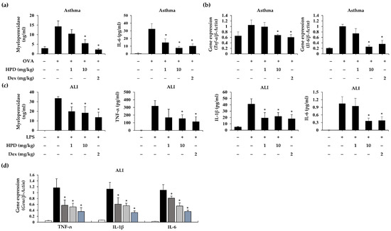 Effects of HPD on proinflammatory mediator secretion and expression in OVA and LPS-induced airway inflammation in BALF and lung homogenates. In OVA-induced allergic asthma model, (a) the levels of proinflammatory mediators (MPO and IL-6) were measured by ELISA and (b) gene expression (TNF-α and IL-6) was analyzed by qPCR. In LPS-induced lung injury model, (c) the levels of proinflammatory mediators (MPO, TNF-α, IL-1β and IL-6) were measured by ELISA and (d) gene expression (TNF-α, IL-1β, and IL-6) was analyzed by qPCR. Dex: dexamethasone. Values are mean ± SEM (n = 5). * p < 0.05 relative to OVA or ALI group.