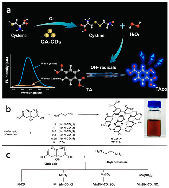 (a) Schematic representation of cysteine-like oxidase activity of CA-CDs. Reprinted with permission from ref. [87]. Copyright 2022, Elsevier. (b) Photographs of the preparation process of N-CDs and the prepared N-CD samples suspended in water. Reprinted with permission from ref. [64]. Copyright 2021, Royal Society of Chemistry. (c) Schematic diagram of the preparation process of Mn, N-CDs. Reprinted with permission from ref. [88]. Copyright 2023, Royal Society of Chemistry.