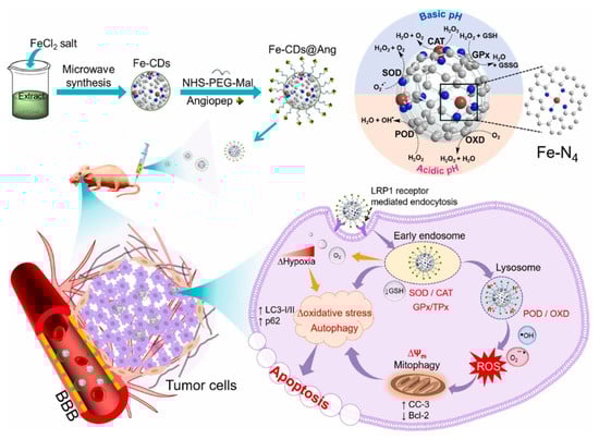 - Muhammad, P.; Hanif, S.; Li, J.; Guller, A.; Rehman, F.U.; Ismail, M.; Zhang, D.; Yan, X.; Fan, K.; Shi, B. Carbon Dots Supported Single Fe Atom Nanozyme for Drug-Resistant Glioblastoma Therapy by Activating Autophagy-Lysosome Pathway. Nano Today 2022, 45, 101530. [Google Scholar] [CrossRef]