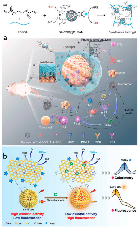 - He, H.; Fei, Z.; Guo, T.; Hou, Y.; Li, D.; Wang, K.; Ren, F.; Fan, K.; Zhou, D.; Xie, C.; et al. Bioadhesive Injectable Hydrogel with Phenolic Carbon Quantum Dot Supported Pd Single Atom Nanozymes as a Localized Immunomodulation Niche for Cancer Catalytic Immunotherapy. Biomaterials 2022, 280, 121272. [Google Scholar] [CrossRef]