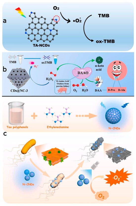 In the preparation process of CDs, doped CDs can be modified by incorporating a small quantity of dopant atoms, which serves to enhance their quantum yield and alter their physical and chemical properties [109]. By doping elements into CDs during their preparation, the resulting CDs exhibit improved fluorescence performance and catalytic capability when contrasted with CDs produced via conventional techniques, thereby broadening their range of applications [110]. Moreover, the introduction of doping elements is pivotal in regulating the properties and catalytic performance of mimetic enzymes, while non-metallic doping exhibits superior biocompatibility with organisms and causes less cellular damage, making them more suitable for applications in biomedicine or therapeutics [111,112]. Through hydrothermal synthesis, Wang et al. [66] successfully synthesized a series of nitrogen-doped CD nanozymes with various molar ratios of precursor substances. These nanozymes exhibited oxidase-like activity, wherein the pyrrolyl nitrogen serves as both the catalytically active site and the substrate-binding site. The oxidation of TMB was catalyzed by activating oxygen to form superoxide radicals. The generation of reactive oxygen species was attributed to the electrons being excited into the conduction band under light stimulation to facilitate the reduction in oxygen. Remarkably, under visible light irradiation, the enzyme demonstrated strong binding to specific targets in mitochondria, leading to its enrichment in the mitochondria of HeLa cells. This localization resulted in the killing of nearly 60% of HeLa cells, underscoring the enzyme’s significant biological activity and its potential for future applications in the treatment of cancer-related diseases (Figure 5a). Li et al. [113] designed and synthesized a carbon-doped nanozyme restricted in a nitrogen-doped carbon framework through pyrolysis of a ZIF-8 precursor filled with glucose (G@ZIF-8). The CD nanozyme demonstrated robust peroxidase-like activity, converting H2O2 into superoxide radicals and oxidizing TMB molecules into blue oxTMB during the chromogenic reaction. To explore the role of the carbon host and CD guest in the catalytic activity of CDs@NC-3, the authors synthesized the NC host and CDs separately and investigated their catalytic activities. The results indicated that the synergetic effect was not the dominate factor in the improvement of catalytic activity and instead was the confinement effect that played a pivotal role in the improvement of catalytic activity. Notably, the saliva of early gastric cancer patients was found to contain elevated levels of D-proline (D-Pro) and D-alanine (D-Ala), while D-amino acid oxidase exhibited chiral-specific catalytic properties in alkaline and neutral conditions, selectively catalyzing D-Pro and D-Ala in these patients. This specific catalysis involved the conversion of D-Pro and D-Ala into H2O2, followed by TMB oxidation based on the H2O2-related catalytic activity of CDs@NC, enabling the detection of D-Pro and D-Ala (Figure 5b). Wang et al. [65] utilized hydrothermal synthesis to produce a nitrogen-doped CD nanozyme with oxidase-like activity. This nanozyme was created by using tea polyphenol and ethylenediamine as precursor. Compared to tea polyphenol alone, the nanozyme displayed significantly enhanced antimicrobial properties. The introduction of nitrogen doping resulted in the formation of surface-active sites such as pyrrolyl nitrogen and graphitic nitrogen structures, allowing the enzyme to alter its electronic energy level and boost its catalytic activity. The enzyme catalyzed O2 to generate superoxide radicals under light radiation. These radicals subsequently oxidated TMB to oxTMB. The nanozyme effectively penetrated the bacterial cell membranes, interacting with intracellular proteins, lipids and nucleic acids, disrupted of cellular structure and function by generating superoxide radicals, thereby inhibiting or eradicating the bacteria. Moreover, the antimicrobial efficacy of the nanozyme was significantly higher under light exposure compared to dark conditions. Furthermore, the antibacterial activity exhibited a synergistic relationship between the concentration of the nanozyme and the duration of light exposure. As the concentration and duration of light increased, this synergistic effect resulted in improved antibacterial efficiency (Figure 5c).