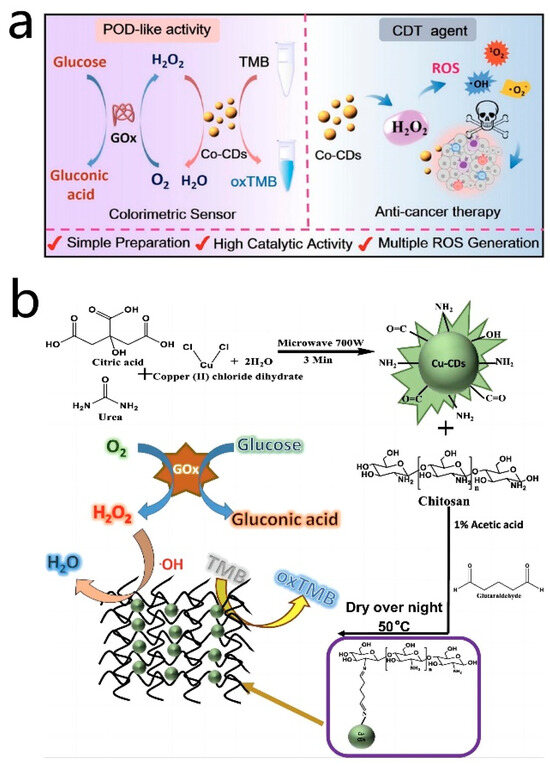 (a) Illustration of the Co-CD nanozyme for colorimetric determination of glucose and anticancer cell effect. Reprinted with permission from ref. [69]. Copyright 2022, American Chemical Society. (b) Schematic representation for the synthesis of Cu-CDs/chitosan film and the detection of H2O2 and glucose. Reprinted with permission from ref. [116]. Copyright 2022, Srikrishna Tummala et al.