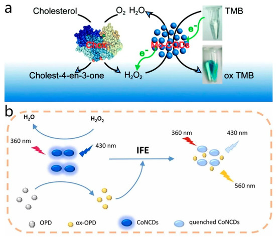 (a) Schematic diagram of cholesterol detection by Mo, S-CDs and cholesterol oxidase. Reprinted with permission from ref. [71]. Copyright 2019, Royal Society of Chemistry. (b) Ratio fluorescence multimodal analysis strategies for H2O2 detection. Reprinted with permission from ref. [77]. Copyright 2021, Elsevier.