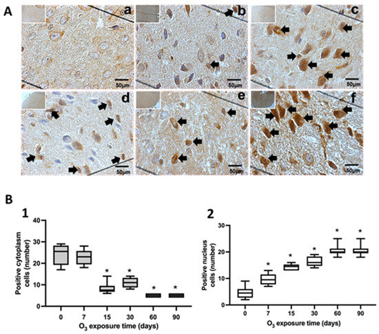 Figure 1. Effect of chronic exposure to low doses of O3 on rat substantia nigra neurons. (A) Micrographs of NFκB in substantia nigra of rats exposed to O3: (a) control, (b) 7 days of O3 exposure, (c) 15 days of O3 exposure, (d) 30 days of O3 exposure, (e) 60 days of exposure to O3, and (f) 90 days of exposure to O3. The micrograph shows an increase in NFκB immunoreactivity in the nucleus at 15, 30, 60, and 90 days of exposure to O3. Arrows indicate the localization of NFκB in the cell nucleus (calibration bar = 50 µm; 100× photomicrograph). (B) The abscissa axis shows the different O3 exposure treatments for the animals, and the ordinate axis shows the median number of cells reactive to NFκB. * p ≤ 0.05. (1) The graph shows the effect of chronic exposure to low doses of O3 on the localization of NFκB in the cell cytoplasm. The results show a cell decrease from 15 to 90 days of exposure to O3 (p ≤ 0.05). (2) The graph shows the effect of chronic exposure to low doses of O3 on the localization of NFκB in the cell nucleus, noting the increase in the nuclear localization of NFκB.