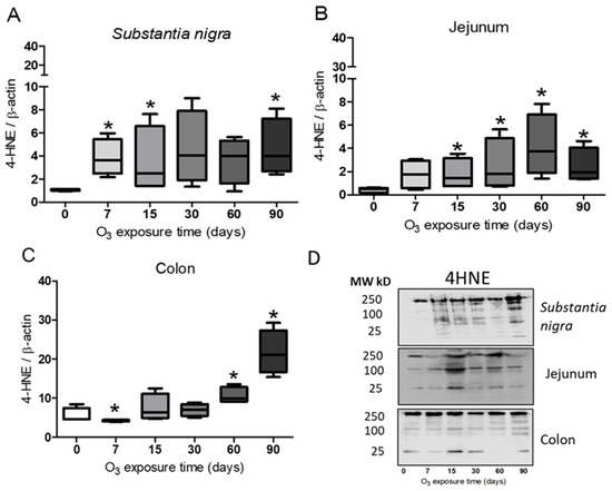 Figure 4. Effect of exposure to O3 on lipid oxidation. The abscissa axis shows the treatment, and the ordinate axis shows the relative abundance of 4HNE represented in arbitrary units. * p ≤ 0.05. (A) Substantia nigra. The results show a significant increase in 4HNE at 90 days compared with the control group. (B), Jejunum. The graph shows a significant increase in 4HNE after 30, 60, and 90 days compared with the control group. (C) Colon presented an increase in 4HNE at 60 and 90 days compared with the control group. (D) Representative images for band analysis.