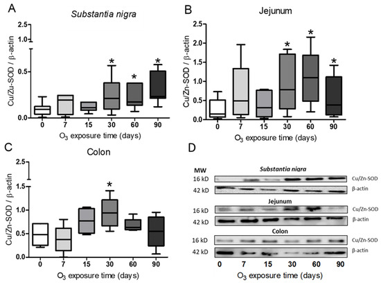 Figure 5. Effect of exposure to O3 on the relative abundance of Cu/Zn-SOD. The abscissa axis shows the O3 treatments, and the ordinate axis shows the relative abundance of Cu/Zn-SOD represented in arbitrary units. * p ≤ 0.05. (A) In the substantia nigra and (B) the jejunum, a significant increase can be observed at 30, 60, and 90 days of exposure to O3 compared with the control group, (C) while for the colon, an increase is shown at 30 days compared with the control group. (D) Representative WBs for each treatment.