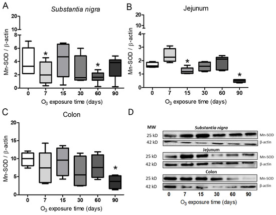 Figure 6. Effect of exposure to O3 on the relative abundance of Mn-SOD. The abscissa axis shows the O3 treatments, and the ordinate axis shows the relative abundance of Mn-SOD represented in arbitrary units. * p ≤ 0.05. (A) Substantia nigra. The Mn-SOD protein decreased at 7 and 60 days and at 90 days in the jejunum and colon, respectively (B,C). (D) Representative WB for each condition.