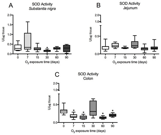 Figure 7. Effect of exposure to O3 on SOD activity in the substantia nigra, jejunums, and colons of rats (* p ≤ 0.05). The abscissa axis shows the different O3 exposure treatments used on the animals, and the ordinate axis shows the SOD units per microgram of tissue. (A) Total SOD enzyme activity in the substantia nigra shows a significant decrease at 30 days of O3 exposure compared with the control group. (B) SOD activity in the jejunum does not show statistically significant variations. (C) In the rat colon, total SOD activity is significantly decreased at 7, 15, 60, and 90 days of O3 exposure compared with control animals. A Mann–Whitney U test was used to compare the groups against their respective controls.