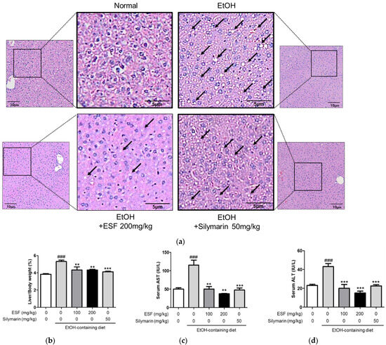 Effects of ESF on ethanol-induced liver injury. (a) H&E-stained liver sections of EtOH-induced liver injury model. The droplets are indicated by the black arrow. All images are visualized at 100×, (n = 10). (b) Liver/BW (%). (c) Activities of AST in serum. (d) Activities of ALT in serum. Data are shown as the mean ± SEM (n = 10). Statistical analyses were different values according to the one-way ANOVA with Tukey’s range test (Normal diet vs. EtOH diet ### p < 0.001; EtOH diet vs. EtOH diet + ESF or silymarin *** p < 0.001, ** p < 0.01).