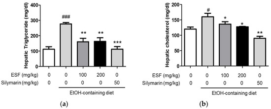 Effects of ESF on alcoholic fatty liver disease. (a) Hepatic triacylglycerol levels. (b) Hepatic cholesterol levels. Data are shown as the mean ± SEM (n = 10). Statistical analyses were different values according to the one-way ANOVA with Tukey’s range test (Normal diet vs. EtOH diet ### p < 0.001, # p < 0.05; EtOH diet vs. EtOH diet + ESF or silymarin *** p < 0.001, ** p < 0.01, * p < 0.05).