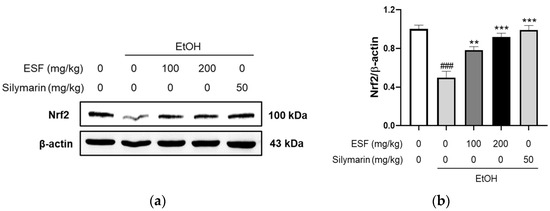 Effects of ESF on Western blot. (a) Nrf2 protein expression showed the effect of 100 or 200 mg/kg ESF and 50 mg/kg silymarin. (b) Nrf2 expression level was normalized by β-actin. Data are shown as the mean ± SEM (n = 10). Statistical analyses showed different values according to the one-way ANOVA with Tukey’s range test (Normal diet vs. EtOH diet ### p < 0.001; EtOH diet vs. EtOH diet + ESF or silymarin *** p < 0.001, ** p < 0.01).