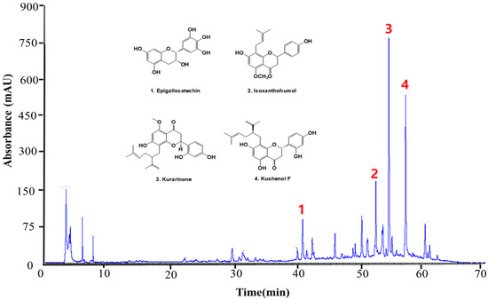 HPLC chromatogram and structure of the polyphenolic compounds in ESF. Epigallocatechin (1), Isoxanthohumol (2), Kurarinone (3), and Kushenol F (4) were the detected compounds at 284 nm.
