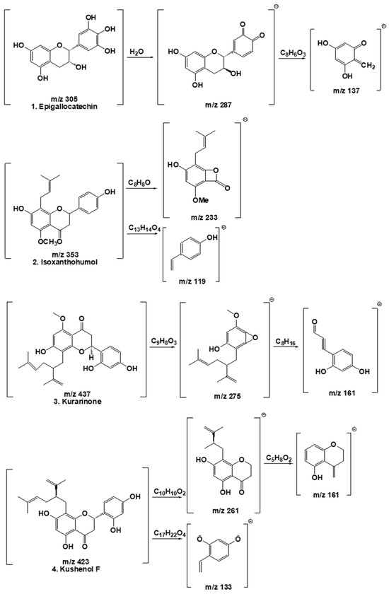 A qualitative analysis of the compounds contained in the ESF was identified by LC-MS/MS. A total of four peaks were identified based on LC retention time and ultraviolet (UV)-vis spectrum (Figure 8). Phenolic compounds were identified as Epigallocatechin (1) [46], Isoxanthohumol (2) [47], Kurarinone (3) [48], and Kushenol F (4) [48]. Four phenolic compounds were identified according to the peaks obtained via high-performance liquid chromatography (HPLC) at a wavelength of 248 nm. The tentative identification of the extract components was based on molecular weights, MS/MS fragmentation, as well as literature data. Compounds were numbered according to their elution order (retention times) (Table 3). Peaks 1, 2, 3, and 4 showed precursor ions [M−H]− at m/z 304.074 (C15H14O7), 439.204 (C21H22O5), 354.147 (C26H30O6), and 423.189 (C26H32O7), respectively. The formation of these compound fragments is presented in Figure 9.