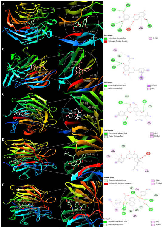 Molecular docking analysis of ESF. (A) Epigallocatechin; (B) Isoxanthohumol; (C) Kurarinone; (D) Kushenol F; and (E) CPUY192018. These were bound to the Keap1 3D structure. Each color represents a direct-bond type of interaction. CPUY192018: positive control.