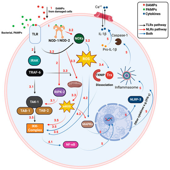Upon activation, TLRs lead to the recruitment of IL-1 receptor-associated kinases (IRAKs) and TNF receptor-associated factor 6 (TRAF-6). This recruitment subsequently activates the TGF-β-activated kinase 1/TAK-1-associated binding protein (TAK-1/TAB-1) complex. The activation of this complex triggers the IKK (IκB kinase) complex, resulting in the phosphorylation and degradation of IκB (inhibitor kappa B) and the release and nuclear translocation of NF-κB to upregulate inflammatory genes [16,24,26]. TLR signaling also stimulates NOX to produce ROS and TRAF-6 enhances mitochondrial ROS (mROS) production, both of which amplify NF-κB signaling and activate the MAPK pathway [19,27,28]. On the other hand, NOD-1 and NOD-2 detect intracellular bacterial components, leading to the recruitment of receptor-interacting serine/threonine-protein kinase 2 (RIPK-2), which also facilitates the activation of the TAK-1/TAB-1 and IKK complexes, similarly resulting in NF-κB activation and nuclear translocation to stimulate immune gene transcription [16,24,26]. NOD pathways further induce ROS production through NADPH oxidase and NOD-2 specifically enhances mROS production, contributing to NF-κB/IKK and MAPK pathway activation [19,27,28].