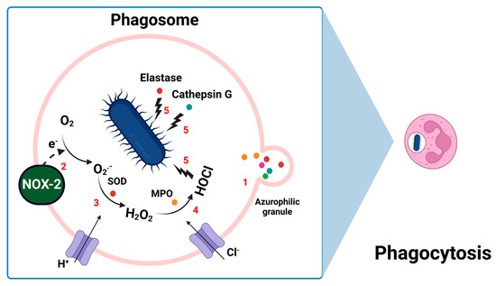 Phagocytosis in neutrophils. Step 1: Mobilization of Azurophilic Granules: Neutrophils mobilize azurophilic granules, specialized lysosomes containing antimicrobial proteins such as MPO, elastase, and cathepsin. The azurophilic granules fuse with the phagosome, releasing their contents to interact with the engulfed pathogen. Step 2: Activation of NOX: the NOX-2 complex on the phagosomal membrane becomes activated, catalyzing the transfer of electrons from NADPH to molecular oxygen, generating ROS in the form of O2−. Step 3: Conversion of Superoxide to Hydrogen Peroxide: SOD within the phagosome catalyzes the conversion of superoxide anion into H2O2. Step 4: Myeloperoxidase-Catalyzed Reactions: MPO released from azurophilic granules uses hydrogen peroxide as a substrate to form HOCl, a potent antimicrobial agent. Step 5: Synergistic Enzymatic Action: enzymes like elastase and cathepsin, alongside HOCl, degrade bacterial proteins, nucleic acids, and cell walls, effectively destroying the pathogen. (MPO: myeloperoxidase; NOX-2: NADPH oxidase 2; ROS: reactive oxygen species; O2−: superoxide anion; SOD: superoxide dismutase: H2O2: hydrogen peroxide; HOCl: hypochlorous acid).